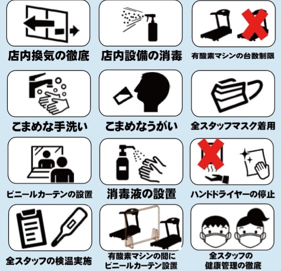 また、当ジムでは皆様に安心してご利用いただけますよう、下記の感染防止対策に徹底して取り組んでおります。